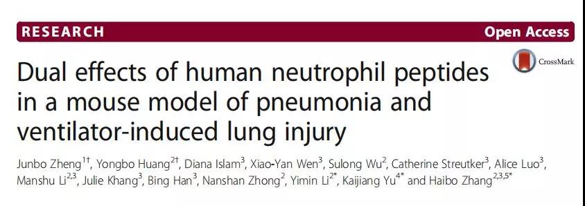 The intensive care medicine team of the SKLRD makes a new progress in the research of the roles of neutrophil peptides in acute respiratory distress syndrome