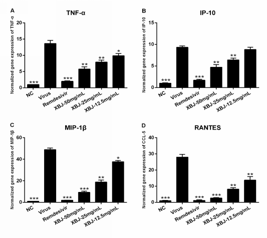 图3 血必净注射液(XBJ)对新冠病毒诱导细胞炎症因子表达的影响