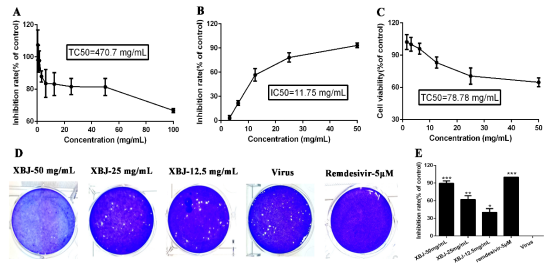 图2 血必净(XBJ)对新冠病毒在VERO E6细胞中诱导引起的细胞病变及病毒空斑形成的抑制检测结果