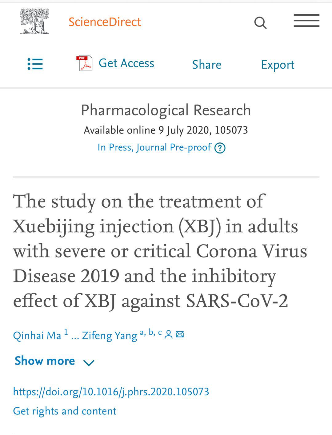 2020-07-275522近日,在钟南山院士的指导下,广州呼吸健康研究院、实验室杨子峰课题组联合东莞市人民医院团队,对“三药三方”的血必净注射液开展了新冠病毒肺炎的典型病例的临床及基础研究。该成果形成论文“The study on the treatment of Xuebijing injection (XBJ) in adults with severe or critical Corona Virus Disease 2019 and the inhibitory effect of XBJ against SARS-CoV-2”的研究论文被国际药理一区期刊(2020年中科院SCI期刊分区)Pharmacological Research(IF5.893)接收。杨子峰教授为本文的通讯作者,广州呼研院马钦海博士、东莞市人民医院邱敏珊、广州呼研院周红霞博士为本文的共同第一作者。