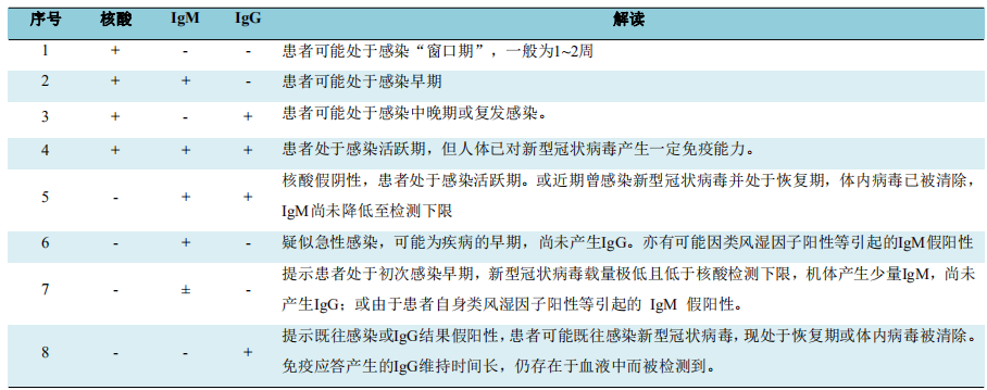 新型冠状病毒血清学检测包括抗原和抗体检测,其中特异性抗体IgM、IgG检测已纳入《新型冠状病毒肺炎诊疗方案》实验室检查部分。对于已确诊的患者,可通过动态监测新型冠状病毒抗原与抗体的滴度变化以评估疗效和疾病转归。基于抗原抗体结合的免疫学检测方法的局限性,标本中的类风湿因子、嗜异性抗体、溶血、纤维蛋白以及因其他类型冠状病毒的抗原交叉反应可导致检测结果呈假阳性。因此,血清学检测结果不能作为新型冠状病毒感染的独立确诊依据,需结合患者临床症状、暴露史、其它实验室检查结果及影像学检查进行综合判断,本共识为此就核酸及血清学分析整合结果进行了解读(图3)。